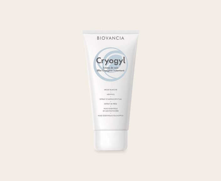 Cryogyl est une crème cosmétique développée par le laboratoire français Biovancia. Elle se présente en tube de 75 ml et s’applique sur la peau à raison d’une à trois fois par jour. La formule rassemble six actifs naturels : un extrait d’harpagophytum titré à 3 % d’harpagosides, du menthol (effet cryogène), de la menthe poivrée et de l’eucalyptus (huiles essentielles complémentaires), de la prêle (silice naturelle) et de l’argile blanche (kaolin).